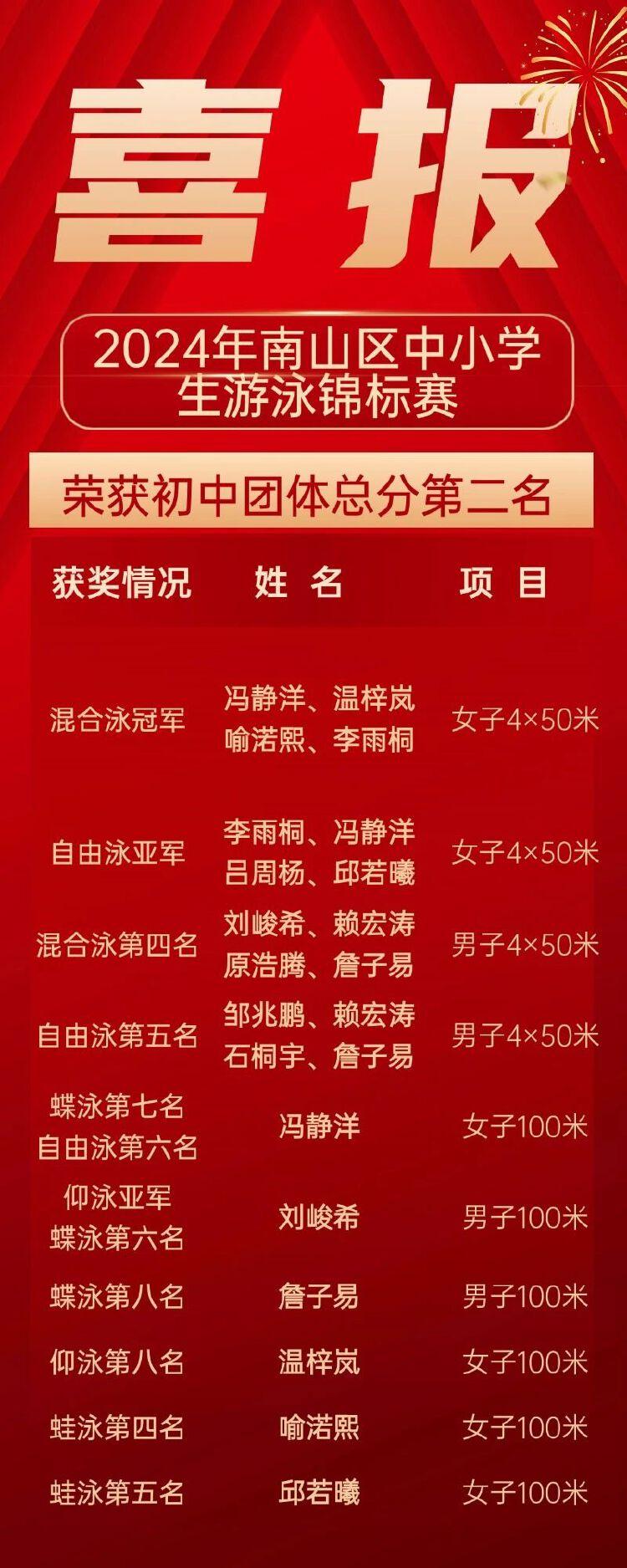 10月19-20日,由深圳市南山区教育局主办的2024年深圳市南山区中小学生游泳锦标赛于在蛇口育才山海学校游泳馆举行。本次比赛中,深圳市南山外国语学校高新中学学子在全区运动员中奋“泳”争先,以1金2银、团体接力比赛均获奖的佳绩荣获初中团体总分第二名 。
