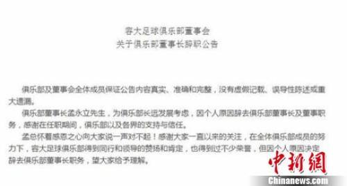 保定容大足球俱乐部董事会关于孟永立辞去俱乐部董事长及董事职务的公告。 吕子豪 摄