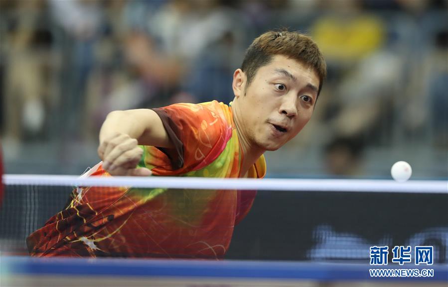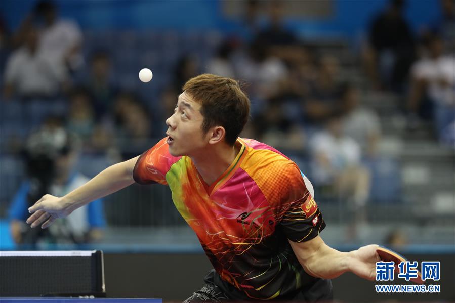 ↑9月2日,许昕在比赛中发球。 新华社记者刘续摄