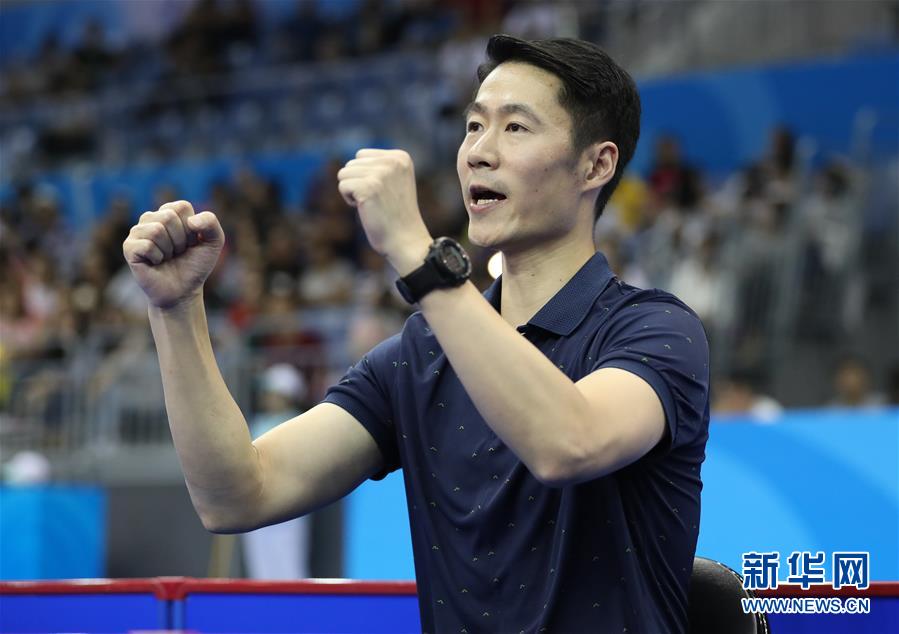 ↑9月2日,上海队教练王励勤庆祝许昕得分。 新华社记者刘续摄