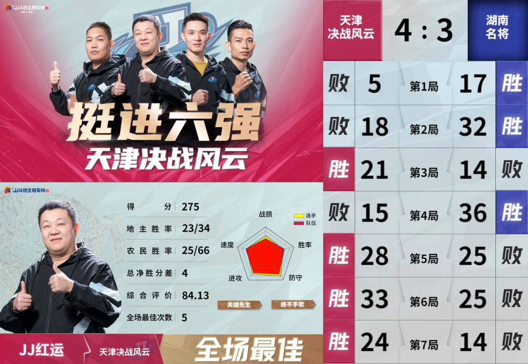 掘开 :8强第一场对战河北队,我感觉和飞龙的配合提高了,但我自己地主能力有一些下滑,应该是手有点生。目前为止的三场比赛打得都挺轻松,但这其实不是好事儿,一直赢容易产生迷之自信,我个人更喜欢去年那种总抢七、在悬崖边的感觉。不过从打湖南名将开始,真正的考验就要来了,我仔细观察过,湖南队的叫分没有之前猛了,他们也在调整中,我个人认为打湖南第一局很重要,谁拿下开门红谁就占据了70%的胜势。