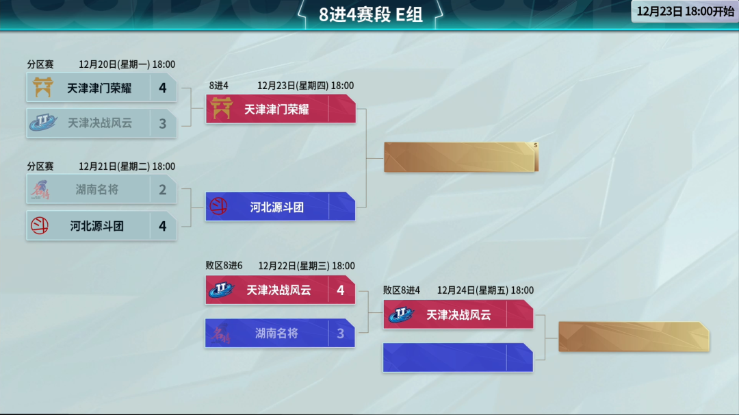 天津决战风云将在明日对阵天津津门荣耀VS河北源斗团中的败者战队,今天18:00,S3总决赛首支4强战队即将诞生,我们直播间不见不散~