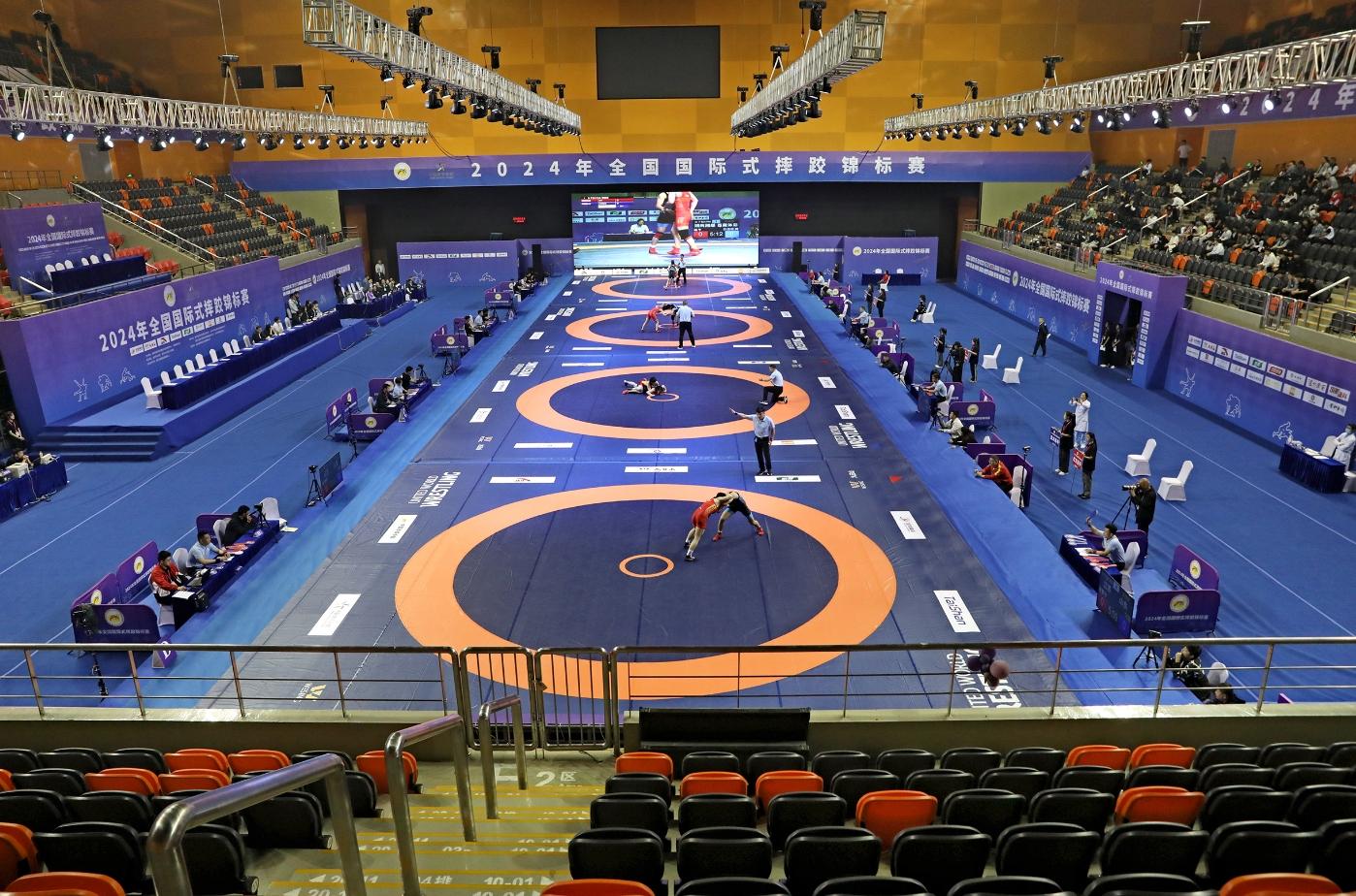 上午9点,在温州奥体中心体育馆,四块场地同时开赛,激烈的场面让人目不暇接。赛场上,只见女选手们技术动作连贯流畅,身体对抗激烈凶悍,跪撑发力快速精准,抱腰滚桥一气呵成,尽显摔跤项目的魅力。