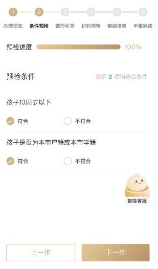 第二步:条件预检。系统将自动判断您的孩子是否符合报名要求,符合即可进行下一步操作。