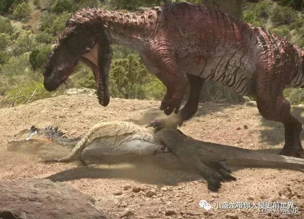 图注:蛮龙痛扁异特龙,截图出自《恐龙革命》