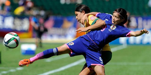 图为2015年6月27日,日本球员川澄奈穗美(右)与澳大利亚球员科尔拼抢。新华社图片