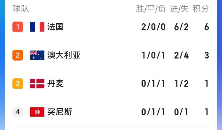 丹麦队的排名在世界第十名,在欧洲的比赛表现得十分神勇,但是来到了世界杯的赛场上,整体表现不是很突出,第一轮比赛原以为可以把突尼斯按在地上摩擦,结果却不尽人意以0:0和突尼斯队握手言和,第二场比赛面对本组势头正盛的法国队,吃了一场败仗,以1:2结束了比赛,本场比赛也是法国队的生死之战,本场比赛战胜澳大利亚队就可以拿到三分积分,出线有望。