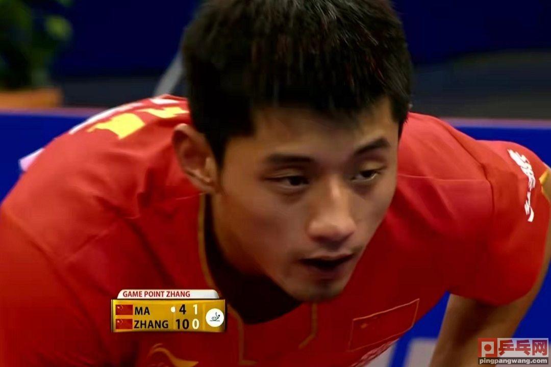 马龙发正手直线球,张继科反手暴拧斜线到马龙正手空当,11-10。