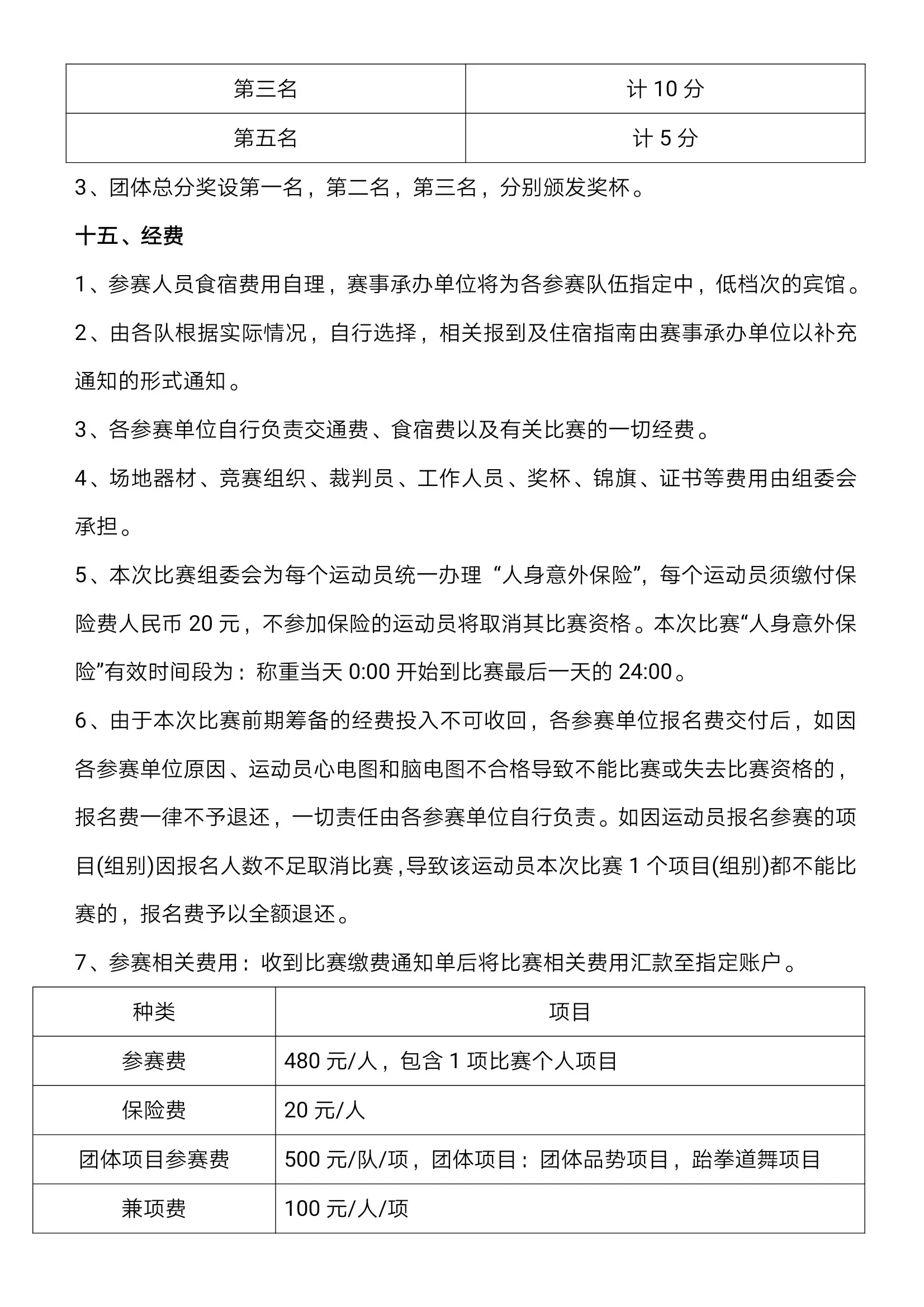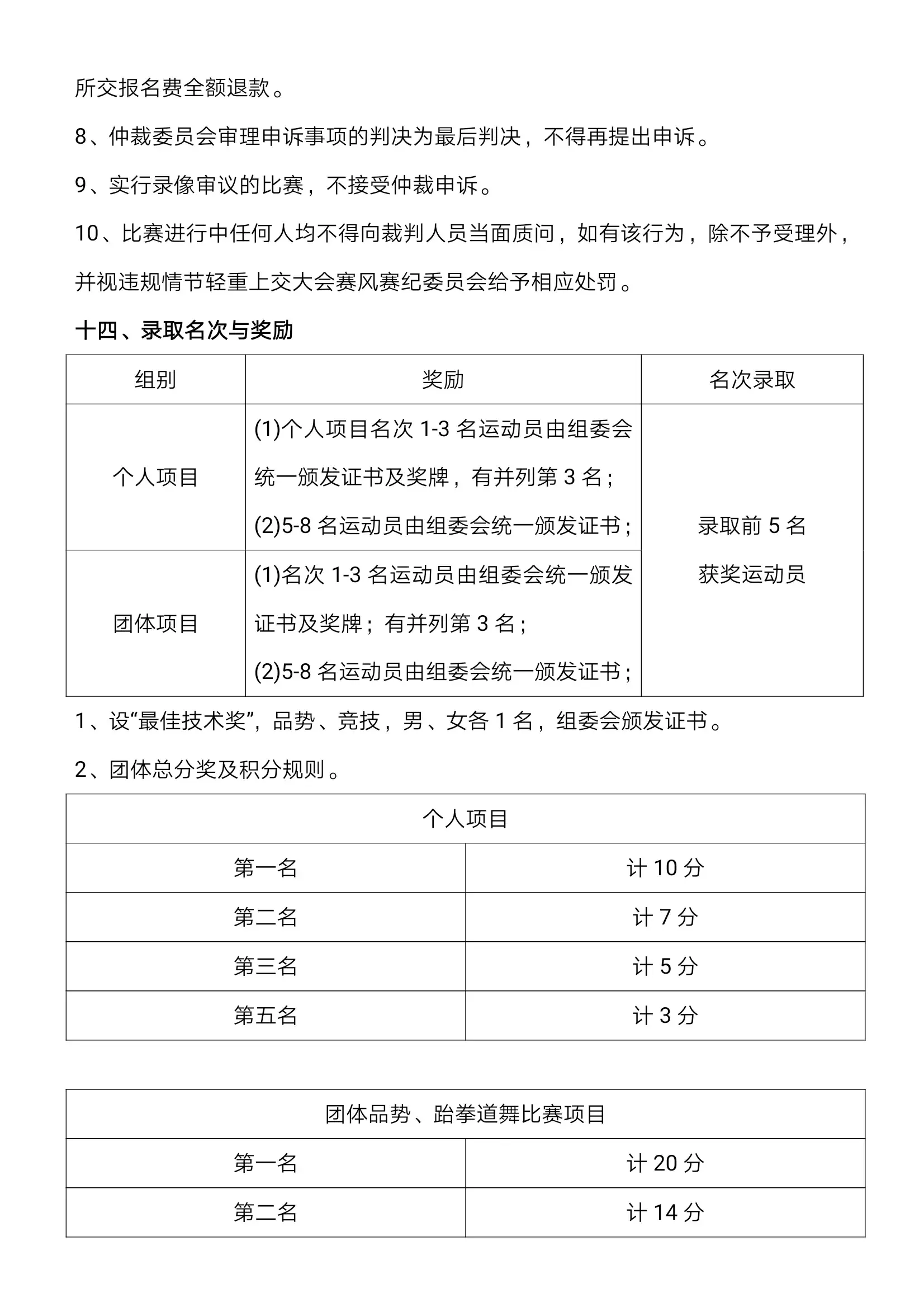 八、录取名次与奖励(一)各级别比赛录取前八名颁发奖状(第三、第四名并列第三名,第五至八名并列第五名),给予前三名颁发奖牌(并列第三名);(二)设“优秀裁判员奖”,由裁判组评选,授予证书;(三)设单位纪念奖,按报名人数给予参赛单位纪念牌匾;(四)“优秀运动员奖”,颁发证书,由编排组根据成绩提名评选;(五)设“优秀教练员奖”,颁发证书,由组委会根据赛场内工作配合度提名评选;(六)设团体总分奖,各组别团体总分前六名的代表队颁发奖杯,积分办法如下:1、个人项目比赛前 8 名积分依次为 10、8、6、5、4、3、2、1;竞技积分:10、8、5.5、2.5(并列第三、第五)。 2、以上积分相加为团体总分。