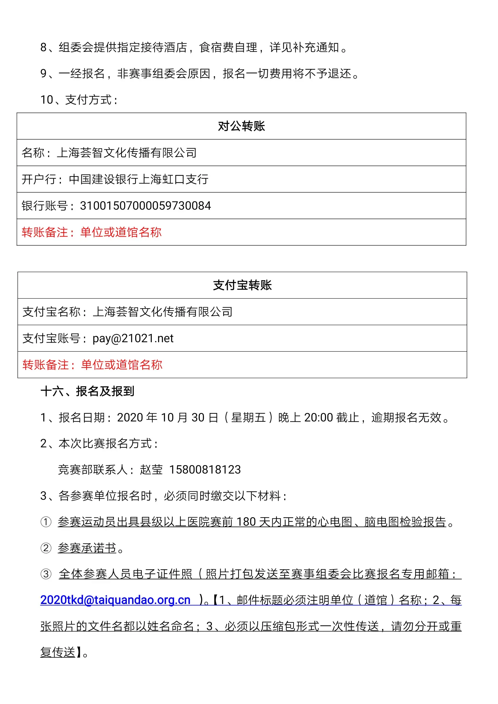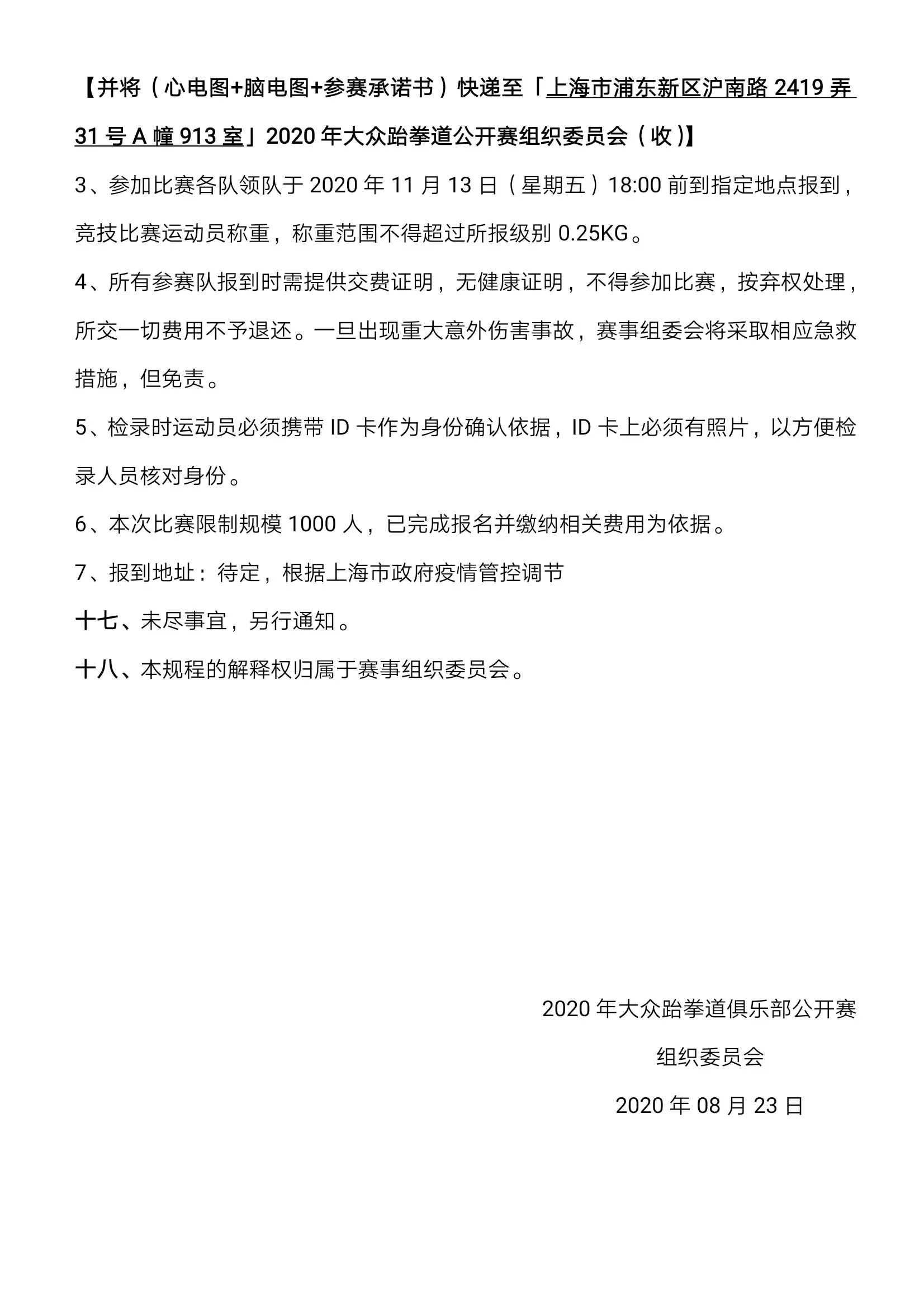 十、报名及报到(一)报名:各参赛单位请关注“深圳市光明区体育中心”、“光明文体通”或“深圳市光明区跆拳道协会”微信公众号留意报名链接:tkd.lingeyun.com/bm/szgm09,并于 2019 年9月 10 日前登陆报名系统完成。网站及手机报名可同步,手机报名可拍照上传学生照片。报名成功后请进行电话确认。(本次比赛统一制作参赛证,各参赛队必须在报名系统里上传运动员照片)。【赛事咨询电话】联系人:林冰 13622325968【报名系统咨询电话】联系人:杨子宏 13380368442(二)报到:1、运动队请按时到赛区进行报到(具体时间地点根据报名人数另行通知),领取秩序册、领队证、教练员证和运动员注册证并签署《免责声明》;2、在报名截止、抽签编排确定后,竞技运动员不得更改参赛级别,超重或超时按失格处理(超重退赛,不退还参赛费,不退保险费);3、称重和检录时出示组委会颁发的注册运动员证;4、各参赛队伍可报领队 1 名、教练员2名;5、赛事组织方提供驻点医生,为运动员提供医疗服务;6、参赛运动员必须确认身体状况能正常参加比赛,未成年人必须由家长或监护人确认同意,由各参赛单位组织参加比赛;比赛期间出现严重意外的伤害事故,全部由赛事承保的保险公司和各参赛单位负责解决,组委会不负担赔偿责任,但会积极提供力所能及的协助。