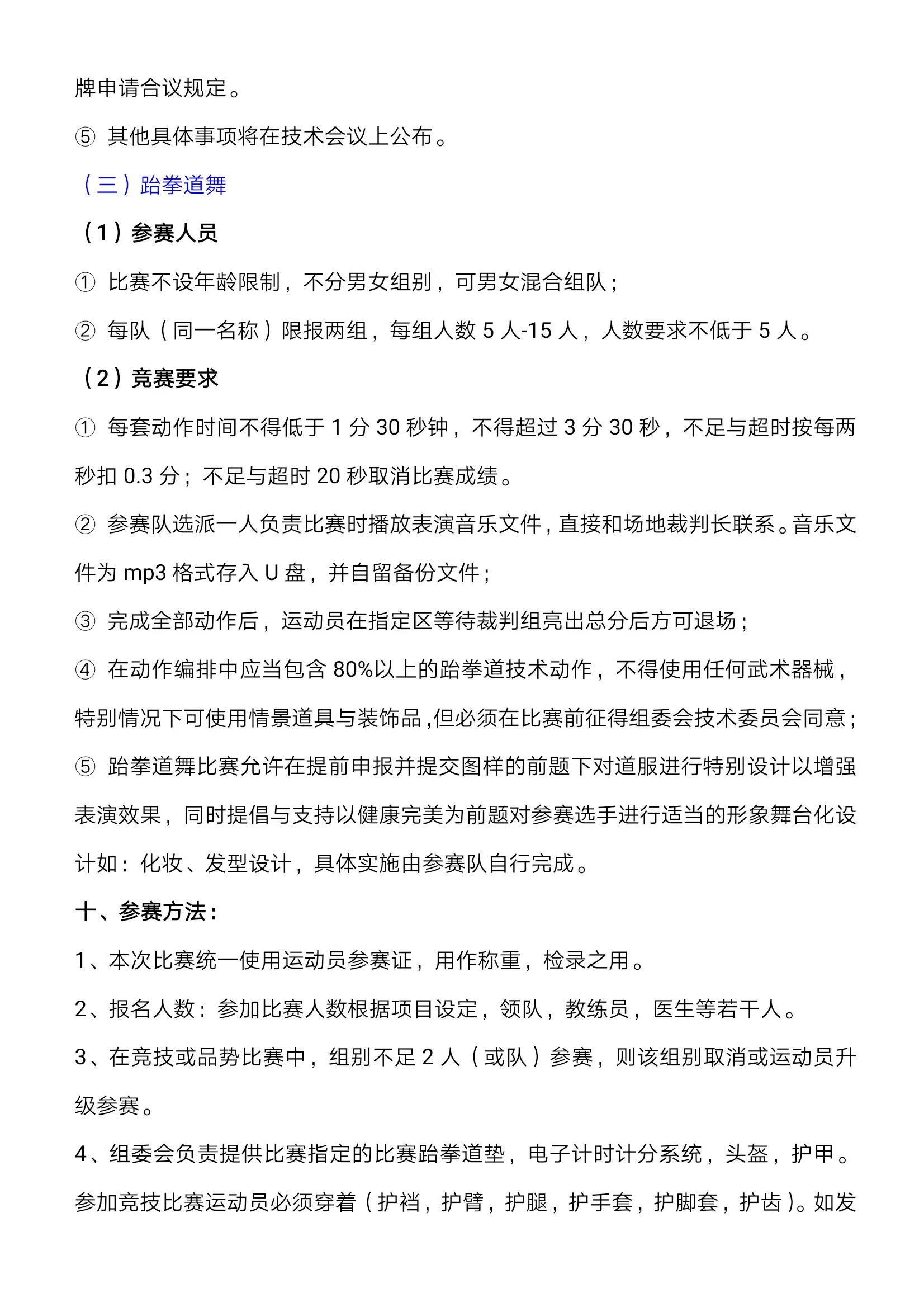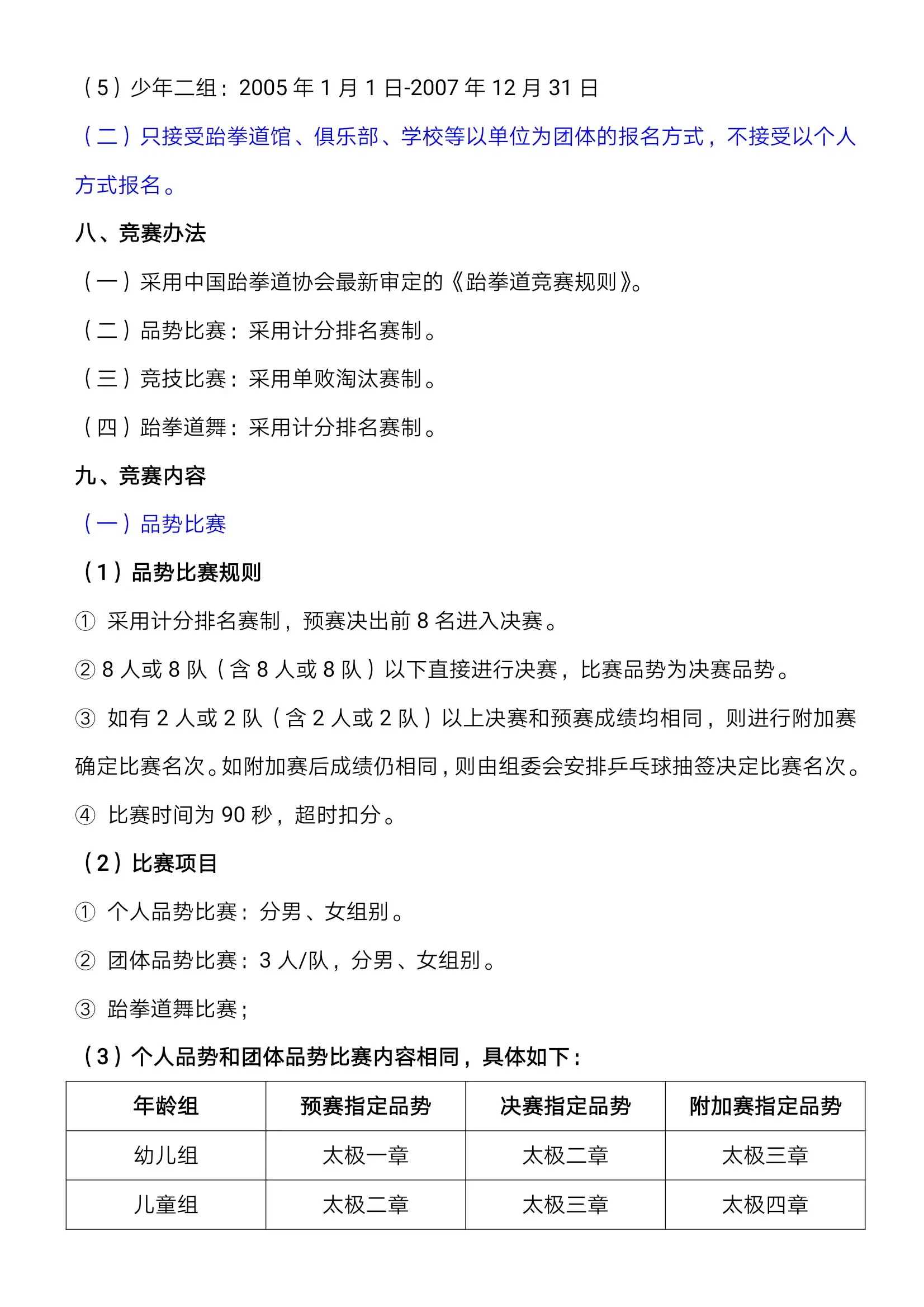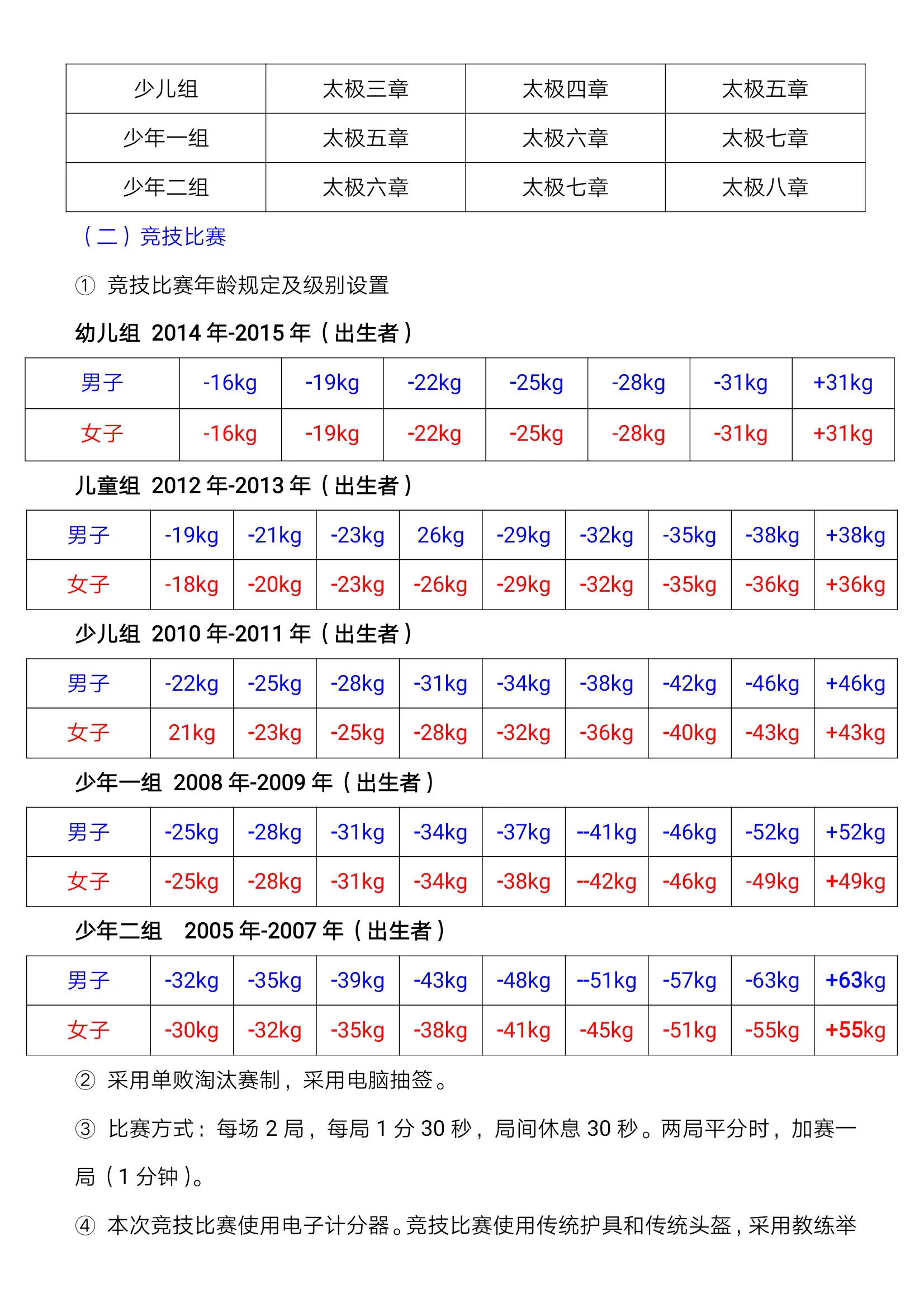 七、竞赛规则及要求;(一)竞技比赛采用个人单败淘汰赛制(PK 赛制),执行中国跆拳道协会最新的竞赛规则。(二)组别人数设置超过 16 人/队的级别将进行再分组,每组分别决出前 8 名;。1、幼儿组、儿童组比赛采用单败淘汰制,每场两局,每局 1 分钟,中间休息30秒。两局比赛得分高者胜。平局时, 进行加时赛,先得分者为获胜方。加时赛平局时,将进行优势判定。2、少儿组、少年组比赛采用单败淘汰制,每场两局,每局 1 分 30 秒,中间休息 30 秒。两局比赛得分高者胜。平局时,进行加时赛,先得分者为获胜方。加时赛平局时,将进行优势判定。3、各级别人数不足 3 人时,按体重或年龄,向上或向下合并该级别进行比赛,如没有合并的级别将取消该组别比赛。4、个人竞技公斤级不允许上下浮动,比赛体重以实际所报级别为准。5、本次比赛采用传统护具,各参赛队自行准备护头、护甲、护臂、护腿、护挡(护阴)、护齿、护手指、腿套,如未按规定穿戴护具,组委会将取消其参赛资格。7、运动员须穿着竞技道服参赛,道服上的所有标识须经竞赛委 员会审查通过后方可使用,不可出现中国、国旗或英文标识 CHINA。8、参赛队伍不得借调专业队运动员(两年内获得国家体育总局计划内赛事前八名或各省市体育局计划内赛事前三名运动员)代表队伍参赛,如查实即取消,全部比赛资格。9、教练员拥有教练员资格证书,并按要求着装整齐,不能穿短裤、拖鞋,否则将不能报名和进场执行教练工作。