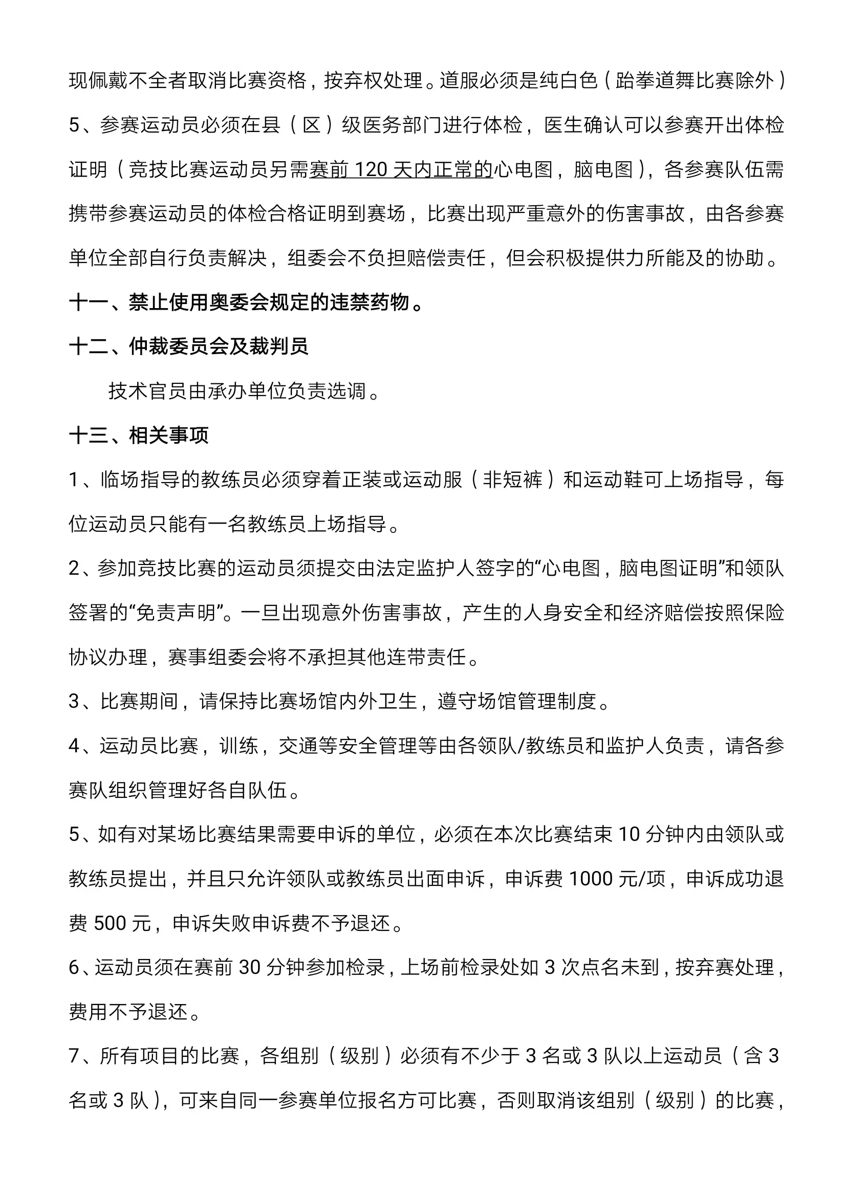 (一)仲裁委员会组成和职责范围按国家体育总局制定的《仲裁委员会条例》执行;(二)申诉程序和规定:比赛结束后 10 分钟内提交申诉报告和申诉录像(必须清晰可见),交纳申诉费人民币 1000 元,申诉成功退还一半申诉费,申诉失败没收全部申诉费;(三)技术代表、仲裁委员、裁判长及裁判员由主办方选派。