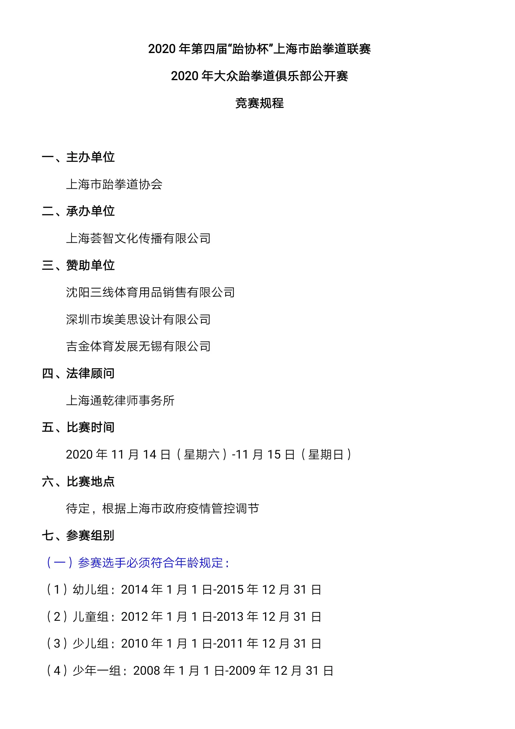 一、主办单位:深圳市光明区文化广电旅游体育局二、承办单位:深圳市光明区跆拳道协会三、协办单位:深圳市光明区体育中心深圳市光明区社会体育指导员协会深圳市龙华区跆拳道协会深圳市宝安区跆拳道协会