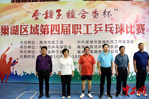 中工网讯 10月1日,合肥市巢湖区域第四届职工乒乓球比赛成功举办,巢湖区域内的37支代表队180名选手以球会友,共庆国庆、中秋“双节”。合肥市人大常委会副主任、合肥市总工会主席张业锁出席开幕式。