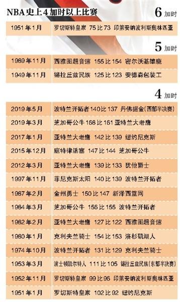 当然,如果将常规赛计算在内,NBA历史上一共出现过17次至少4加时的比赛,其中包括1次6加时和2次5加时。