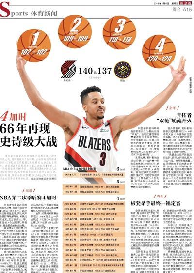 开拓者与掘金之间的西部半决赛上演一场史诗级大战,两队激战4个加时赛,主场作战的开拓者最终以140比137取胜,系列赛总比分2比1领先。这是NBA季后赛历史上第二次出现4加时,上一次还要追溯到66年前。两队鏖战68分钟,5人出场超过50分钟,其中约基奇在场上坚持了65分钟;麦科勒姆、穆雷分别砍下41分、34分,两人均创造职业生涯季后赛得分纪录。