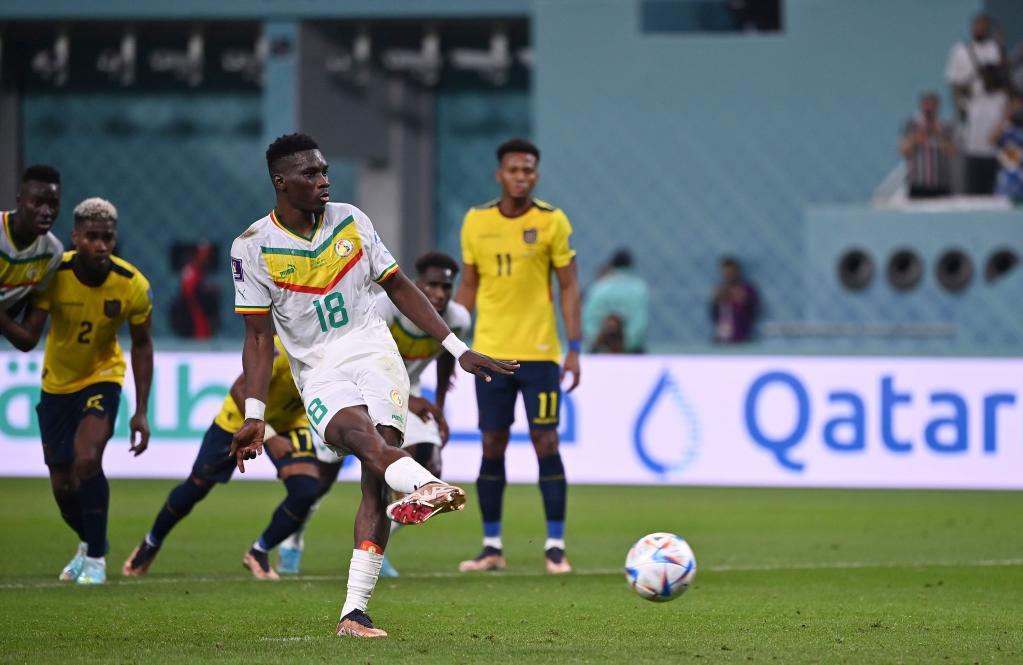 11月29日,塞内加尔队球员伊斯梅拉·萨尔(前)在比赛中主罚点球破门。新华社记者 陈诚 摄