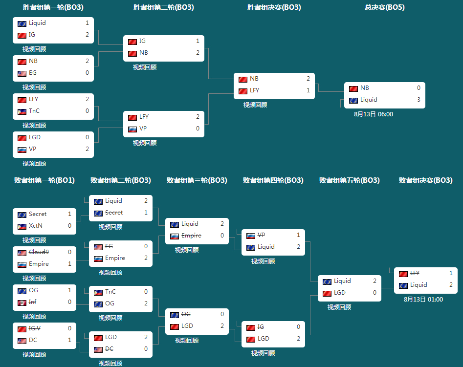 8月13日,美国西雅图钥匙球馆,TI7总决赛,美国Liquid VS 中国NEWBEE,Liquid三比零碾压newbee夺冠,中国队包揽2345名。