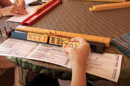 麻将协会的会员艾伦告诉我,每年麻将协会都会发行牌局表,上面是麻将的游戏规则,列出了几个不同赢牌的麻将组合。每年只有五十二个局可以赢牌,打牌时将牌局表贴在桌子上,按上面规定的牌局去赢。许多有经验的麻将玩家为了增加游戏的刺激性,会为每一局麻将下一些赌注,但数额相对较少,一般每人下注的金额不会超过10美元。