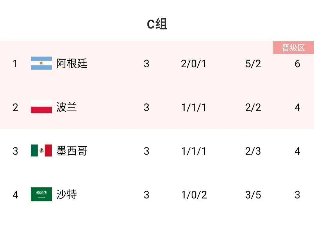 波兰通过二场附加赛,一波三折的进入世界杯的32强,小组赛中,波兰0-0墨西哥,波兰2-0沙特,波兰0-2阿根廷,以1胜1平1负的战绩,积4分位居次席,依靠净胜球的优势力压墨西哥小组第二出线。墨西哥是世界杯的常客,因少1个净胜球的劣势被遗憾地淘汰出局。曾经世界杯的“送分童子”沙特,首场逆转掀翻阿根廷,高居榜首,让人刮目相看,不过也仅是昙花一现,最终2连败垫底被淘汰出局。
