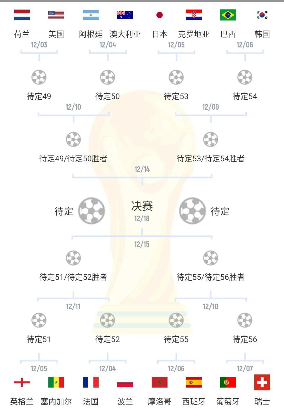 上半区:荷兰vs美国,阿根廷vs澳大利亚,日本vs克罗地亚,巴西vs韩国。