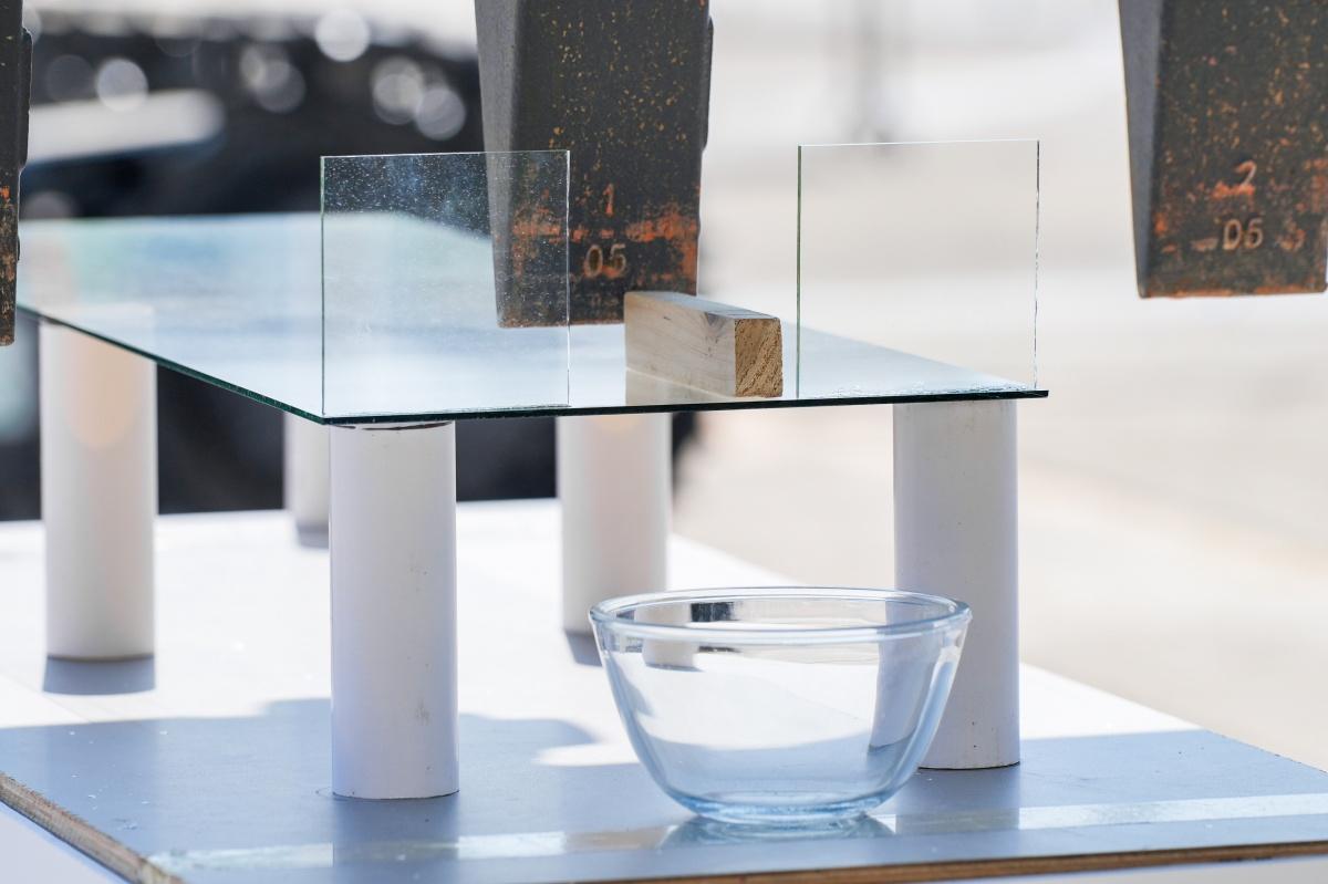 参赛选手驾驶挖掘机,正在将玻璃板上的小木块推移到指定的碗内 。柳工供图