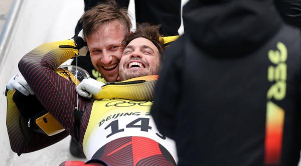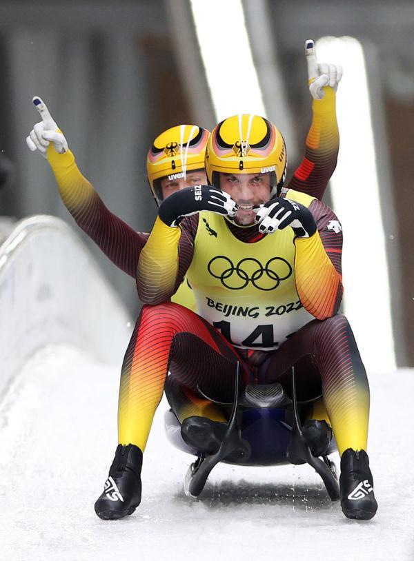 ↑德国队选手托比亚斯·文德尔和托比亚斯·阿尔特在比赛中冲线后庆祝。新华社记者 姚剑锋 摄