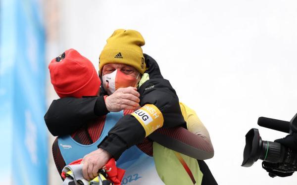 ↑德国队选手纳塔莉·盖森贝格尔和教练拥抱庆祝。新华社记者 姚剑锋 摄