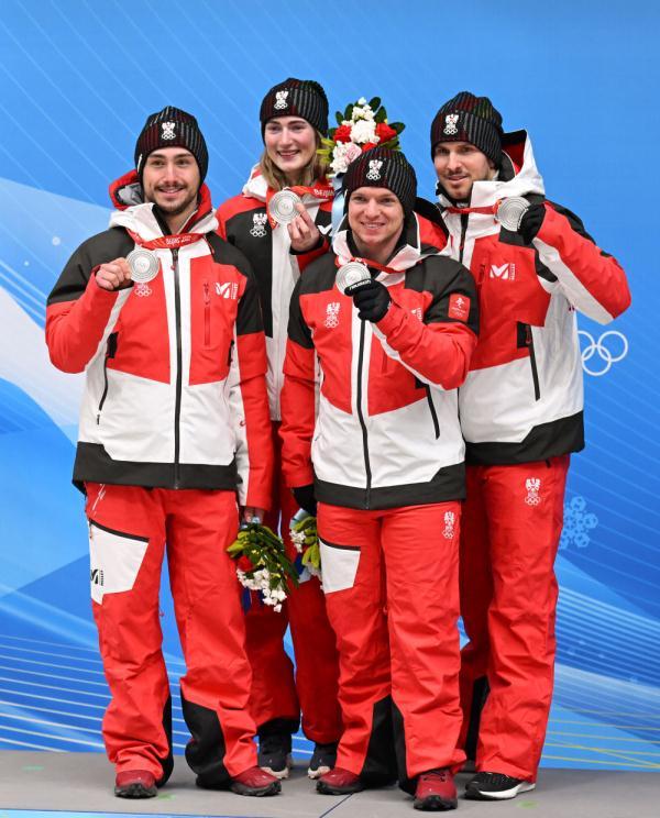 ↑亚军奥地利队在颁发奖牌仪式上。新华社记者 贺长山 摄