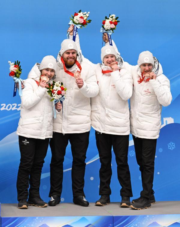 ↑季军拉脱维亚队在颁发奖牌仪式上。新华社记者 贺长山 摄