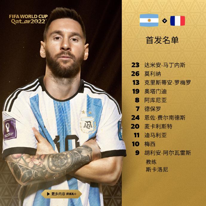 阿根廷队首发:23-马丁内斯/26-莫利纳、13-罗梅罗、19-奥塔门迪、8-阿库尼亚/7-德保罗、24-恩佐-费尔南德斯、20-麦卡利斯特、11-迪马利亚/10-梅西、9-阿尔瓦雷斯