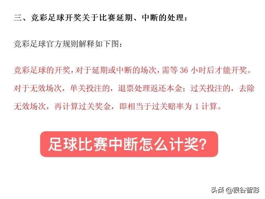1、该场比赛在下一期足球彩票开奖前补赛,则该场比赛的开奖以实际比赛结果为准,当期计奖工作推迟进行;