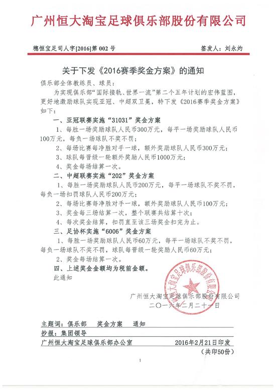 联赛方面,恒大实施的是“202”方案。除赢球有200万元奖金外,球队如果在联赛中输球则将被罚款200万元;每场比赛每净胜对手一球,奖励100万元