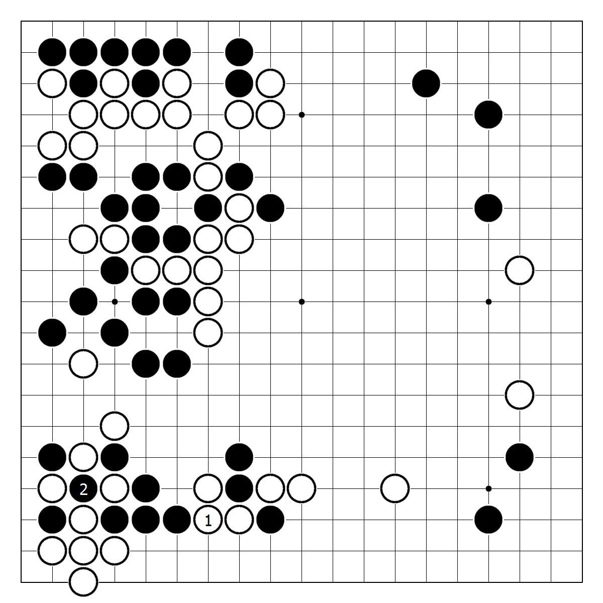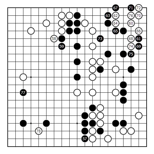 参考谱六 :坂田荣男(白)对藤泽秀行(黑),日本棋院第6期日本最高位决定战挑战五番棋第一局,弈于1961年1月6日。第74手是标准的手筋,使用在这里,非常恰当。