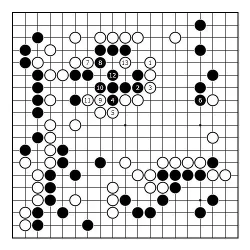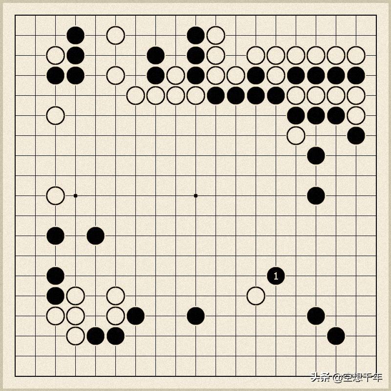 日本第11期专业十杰战, 武宫正树 VS 石田芳夫弈于 1974年3月6日,这是宇宙流的雏形。黑1尖冲,攻击白棋,白棋即使妥协,似乎也是不够的。