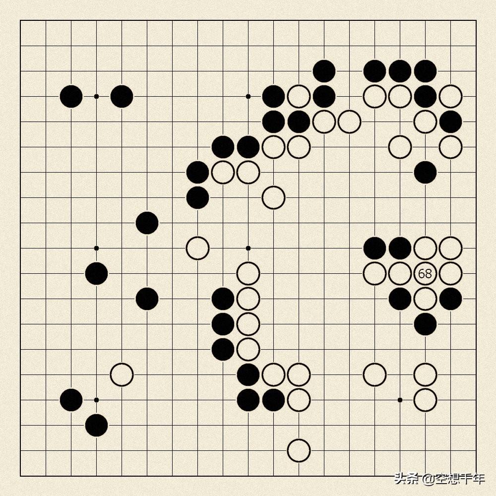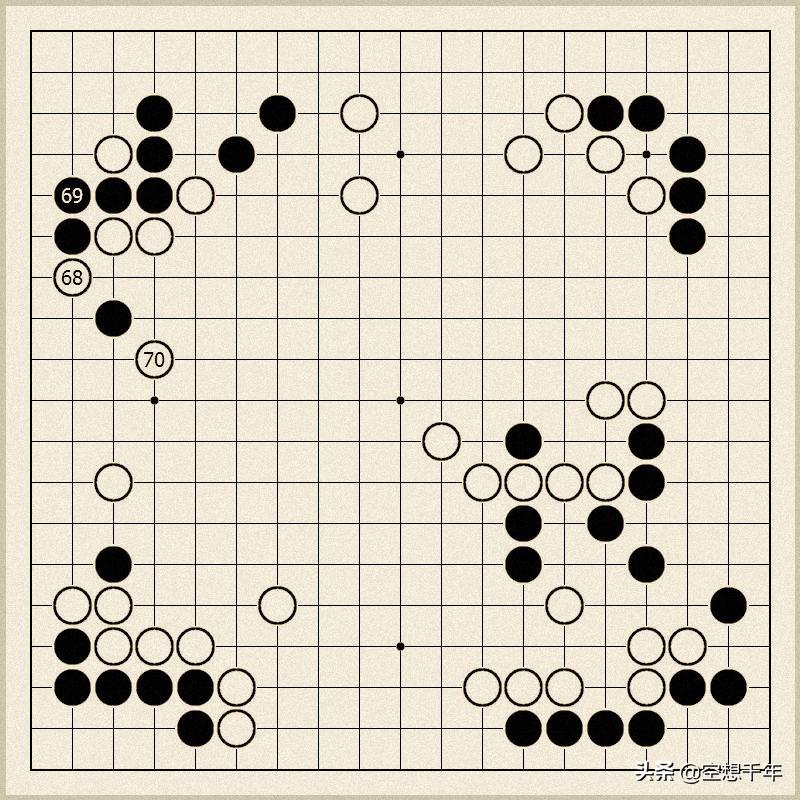 参考谱九:木谷实(白)对加藤信(黑),这手棋是大名鼎鼎的68粘,据说这是带有执着信念的一手。