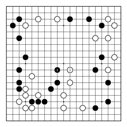 参考谱四:日本副帅武宫正树(黑)与中国主帅聂卫平(白)的对局,取材于第二届中日擂台赛对局, 1987年3月31日弈于 中国北京。聂卫平白28飞,异常漂亮,飞向宇宙,浩瀚无垠。