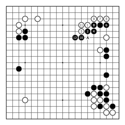 参考图十二:白棋如果粘,黑棋提劫,白棋面临无劫的尴尬。