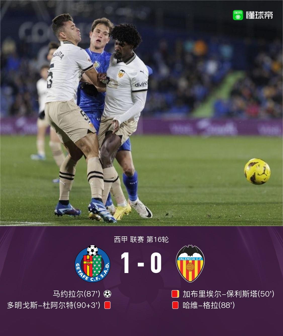北京时间12月09日西甲 联赛 第16轮,赫塔费主场对阵瓦伦西亚。上半场,双方都未能进球,各自只有一脚射正,客队吃到两张黄牌。下半场,保利斯塔防守犯规吃到第二张黄牌,裁判将其罚下。随后双方连续做出换人调整。边路传中,马约拉尔头球打破场上僵局。哈维-格拉因对裁判出言不逊被直红罚下。补时阶段,杜阿尔特也因言语问题被出示红牌罚下。最终10人赫塔费主场1-0艰难战胜9人瓦伦西亚。