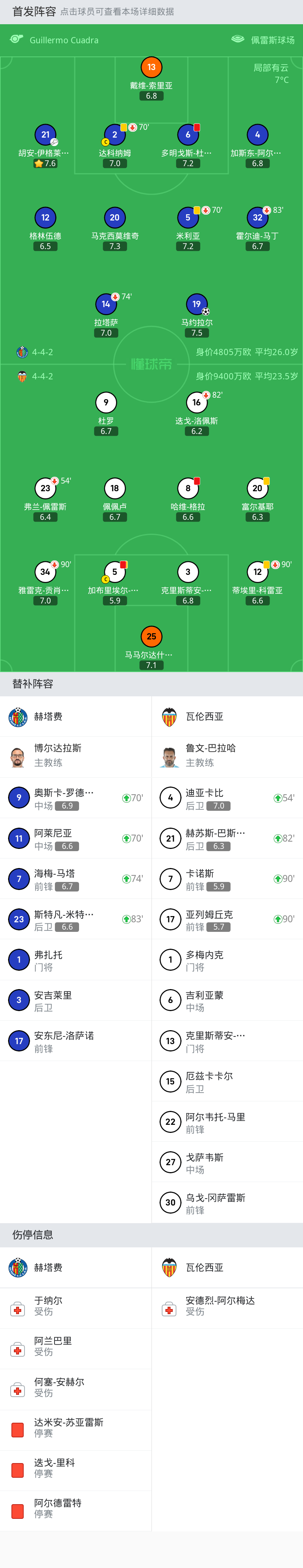 瓦伦西亚 首发:5-加布里埃尔-保利斯塔, 20-富尔基耶, 18-佩佩卢, 9-杜罗, 12-蒂埃里-科雷亚, 25-马马尔达什维利, 23-弗兰-佩雷斯, 16-迭戈-洛佩斯, 3-克里斯蒂安-莫斯克拉, 34-雅雷克-贡肖罗夫斯基, 8-哈维-格拉