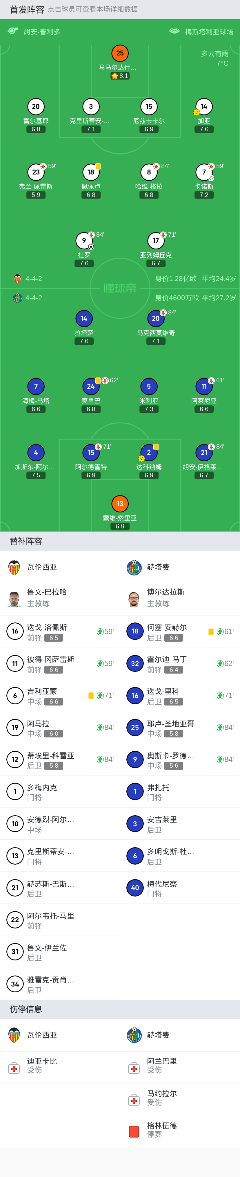 瓦伦西亚 首发:20-富尔基耶, 14-加亚, 17-亚列姆丘克, 7-卡诺斯, 18-佩佩卢, 9-杜罗, 25-马马尔达什维利, 15-厄兹卡卡尔, 23-弗兰-佩雷斯, 3-克里斯蒂安-莫斯克拉, 8-哈维-格拉
