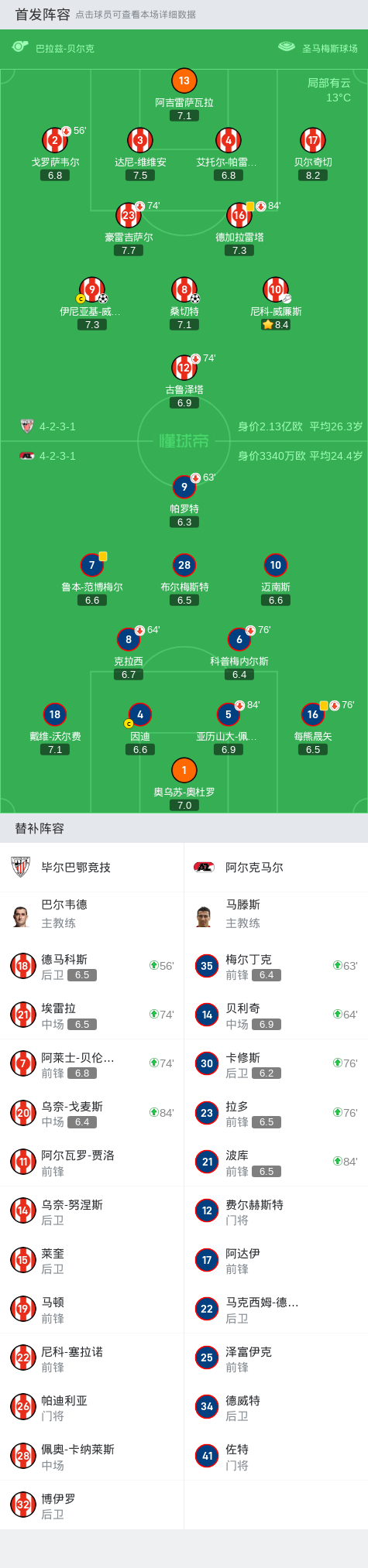 在欧足联欧洲联赛的较量中,毕尔巴鄂竞技迎战阿尔克马尔。上半场主队占据上风,但未能将优势转化成进球。贝尔奇切禁区左路的射门击中横梁。下半场,尼科-威廉斯传中,伊尼亚基-威廉斯破门打破场上僵局。桑切特补射破门扩大比分。最终毕尔巴鄂竞技2-0战胜阿尔克马尔。