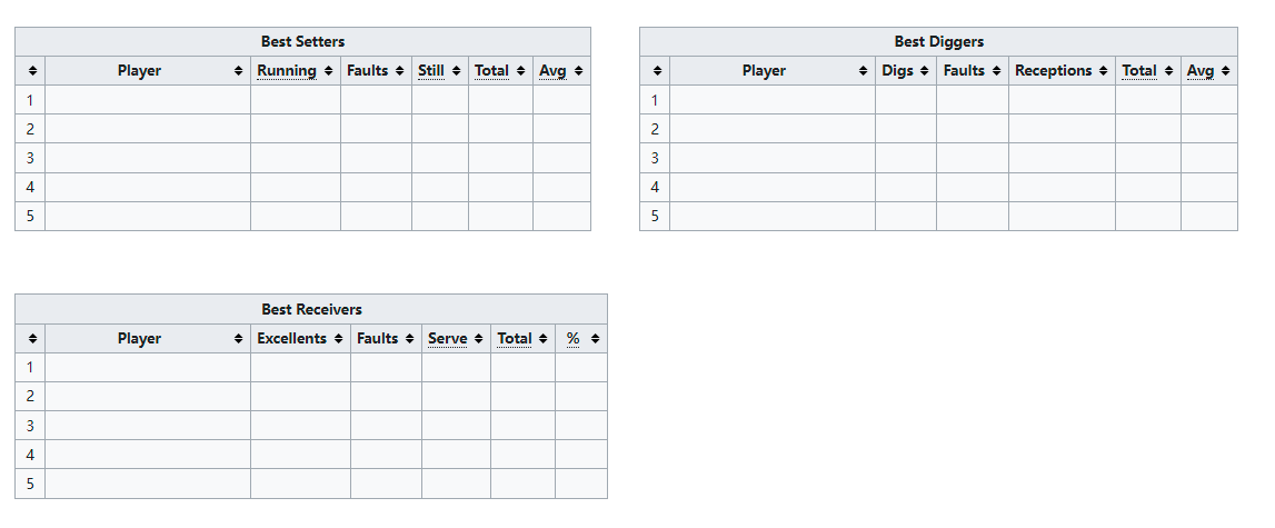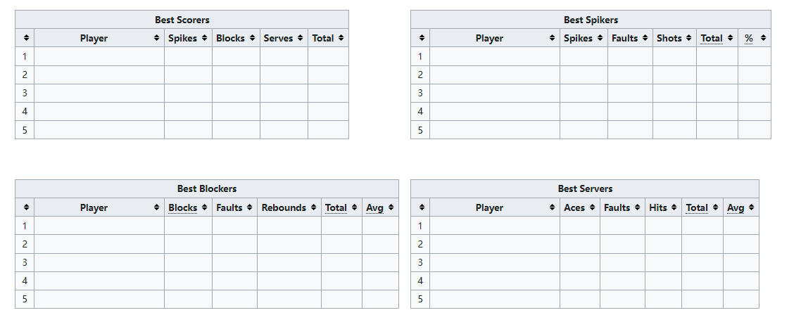 每一组的统计数据遵循VIS(排球信息系统)报告P2和P3。统计数据包括6项排球技巧;发球、一传、二传、扣球、拦网和防守。下表显示了每项技能中排名前五的球员加上比赛结束时的最高得分者。