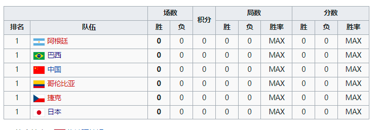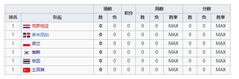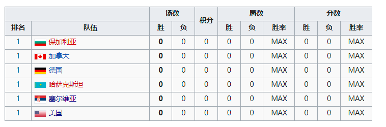— 依次按照胜场数、积分、C值(胜负局比)和Z值(得失分比)决定球队在小组的排名。如果发生2支球队上述四项数值都相同,则按这2支队伍胜负决定名次,胜者在前;如果发生3支或更多的球队上述四项数值都相同,则只取这3支或更多的球队按这四项数值得到的结果进行排名。