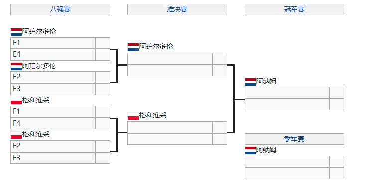 — SF1和SF2的负者进行三、四名决赛;SF1和SF2的胜者进行冠亚军决赛。
