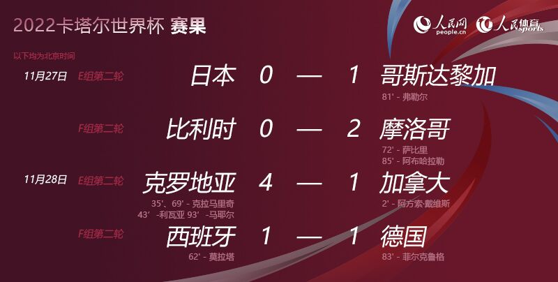 人民网北京11月28日电 (记者杨磊)北京时间28日凌晨,卡塔尔世界杯小组赛展开了一场焦点之战,德国队与西班牙队在E组小组赛第二轮中碰面,下半场西班牙队替补莫拉塔率先破门,随后德国队替补登场的菲尔克鲁格扳平比分,最终两队1:1握手言和,德国队两轮过后得到1分,依然保留着晋级淘汰赛的希望。本场比赛之前,克罗地亚队4:1大胜加拿大队,克拉马里奇梅开二度;俄罗斯世界杯季军、世界排名第二的比利时队0:2不敌摩洛哥队,爆出了一个冷门;日本队0:1不敌哥斯达黎加队,将E组出线形势的悬念保留到了最后一轮。