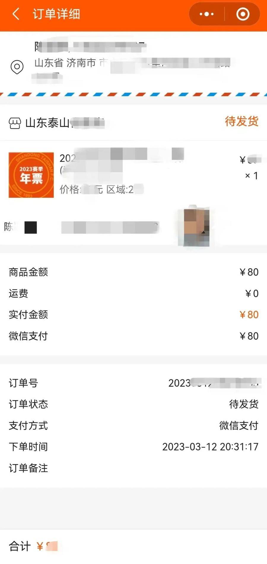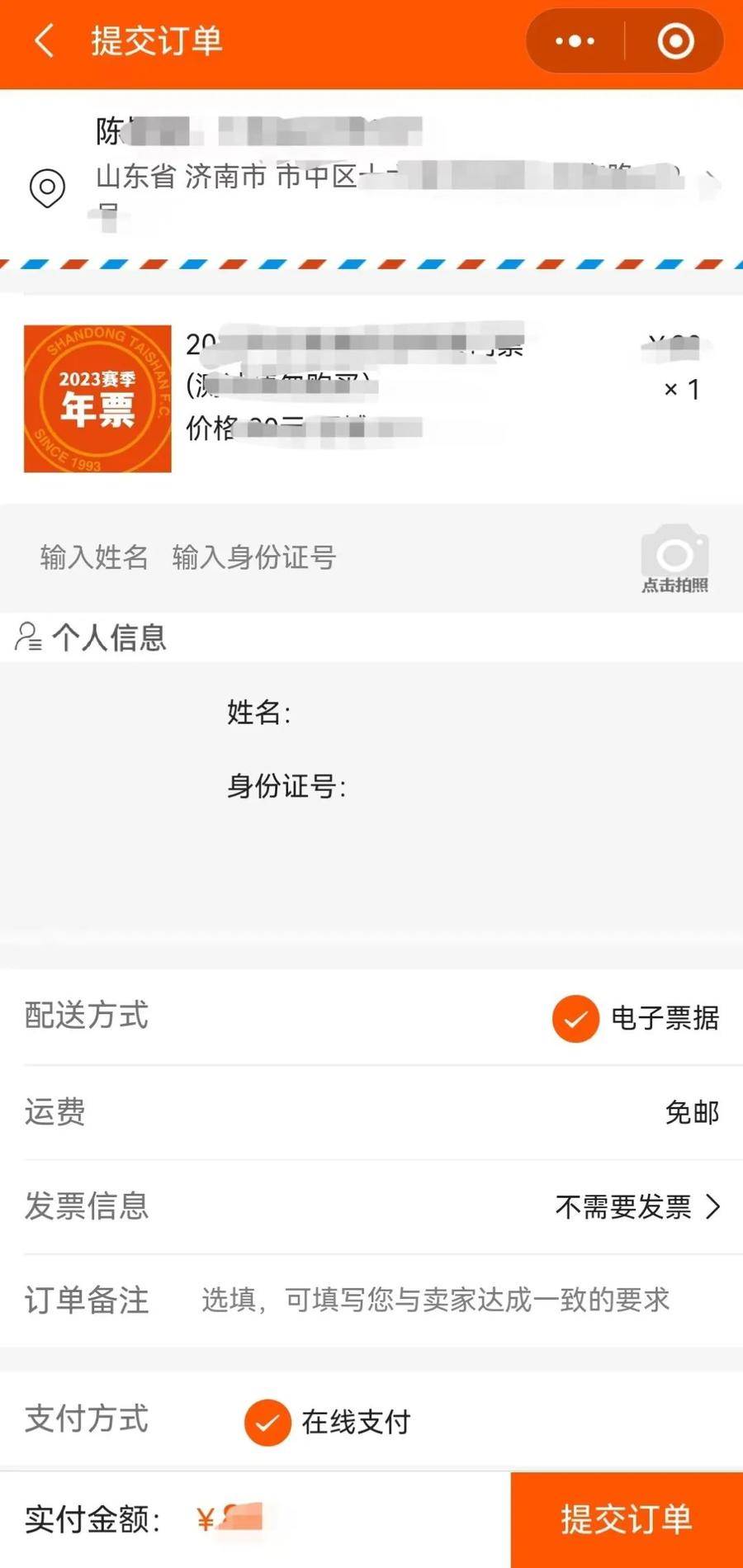 (一)2023赛季山东泰山队主场赛事年票均采用实名制销售,购票人按后续购买流程指导信息进行购买,同步填写观赛人的姓名、身份证号码、手机号码。