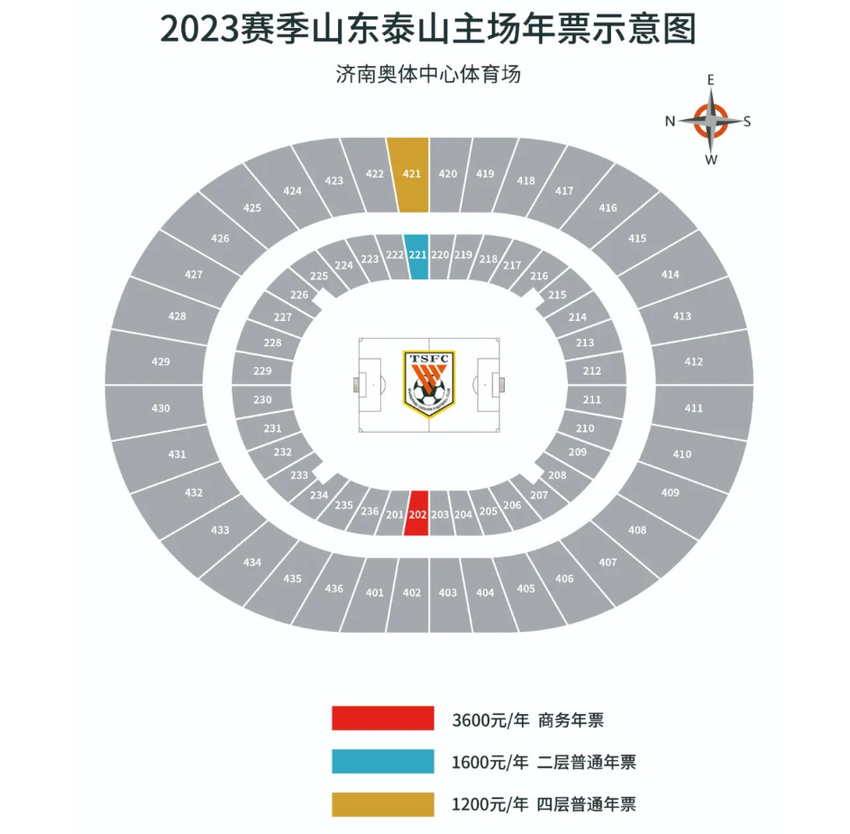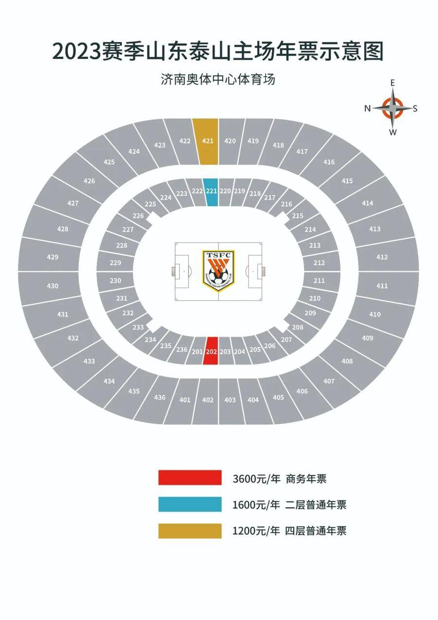 泰山队主场年票销售时间为4月7日10:00至23日17:00,其中202区(商务年票)价格为3600元,限量200张;221区年票价格为1600元,限量700张;421区年票价格为1200元,限量1000张。值得一提的是,年票所在区域均为球场东西侧的绝佳观赛区。