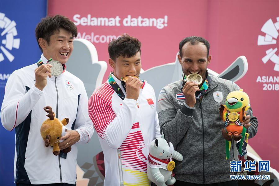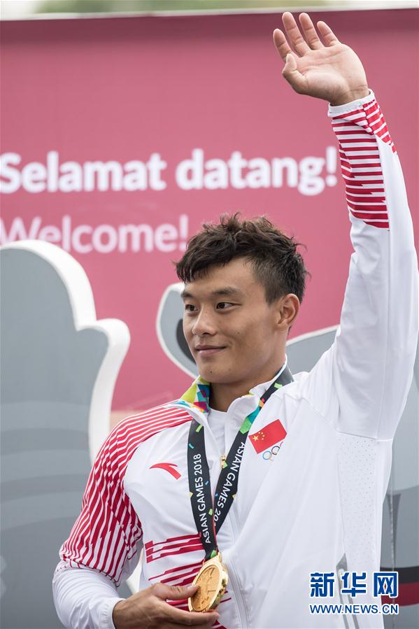 8月23日,中国选手全鑫在颁奖仪式上。 当日,在第18届亚运会皮划艇激流回旋男子单人皮艇比赛中,中国选手全鑫以89秒39的成绩获得金牌。日本选手足立和也以90秒26的成绩获得银牌,泰国选手赫尔曼以90秒40的成绩获得铜牌。 新华社记者吴壮摄