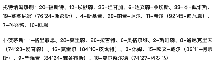 热刺首发:20-福斯特、6-桑切斯、12-埃莫森、25-坦甘加、33-本-戴维斯、19-塞塞尼翁(77’24-斯宾塞)、29-M-萨尔、38-比苏马、7-孙兴慜、10-凯恩、11-布莱恩-希尔(92’66-迪韦恩)